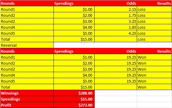 Good thing with Half time/ Full time betting strategy is that you can do combinations of bets such as draw, home to win or away to win. However, take note that this type of strategy needs patience. At first, your wager increases as well as your losses. Take a look at the example below. The round started at $1 then go all the way to $15 as total spending. However, during the reversal round, the odds goes up to 19.00 whereas, the possible winnings is $288 -$15 which is the spending. Therefore, the possible profit is $273 which is definitely not bad.